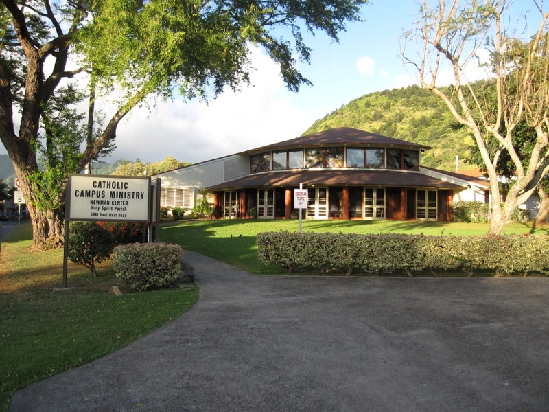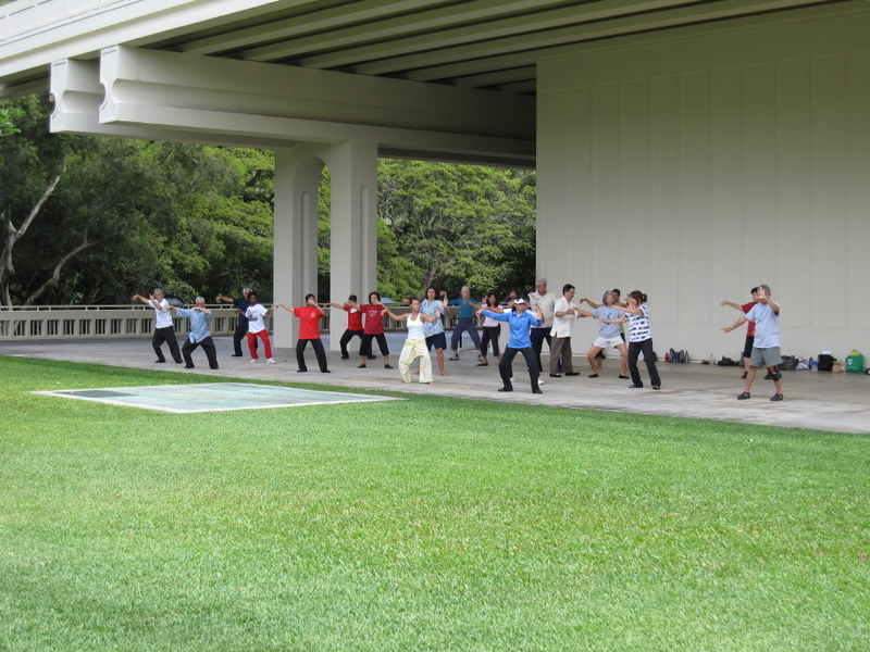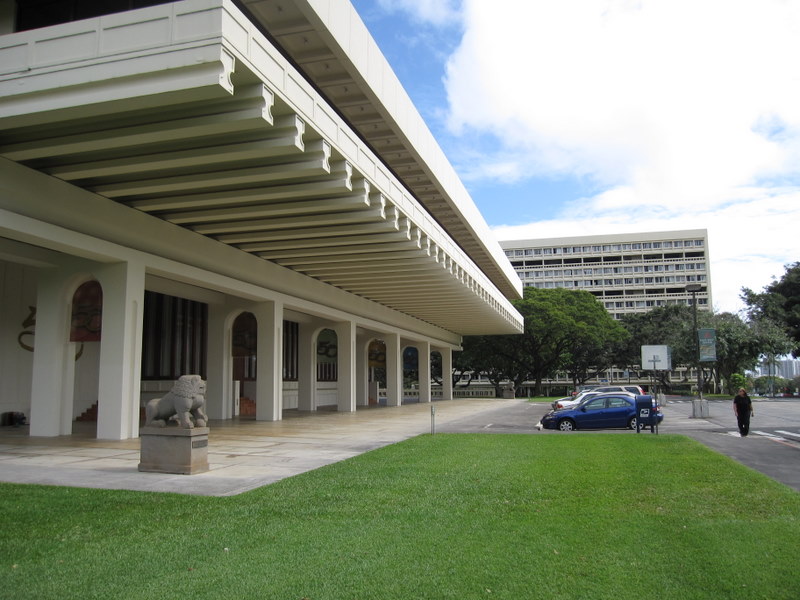 日曜日に太極拳を楽しむ人々 イースト・ウェスト・センター ジェファーソン・ホール(国際会議場) 背後はラナイとなっており、その下方に日本庭園 かつてジェファーソン・ホール地階は 日本庭園に面したレストランだった(残念!) |