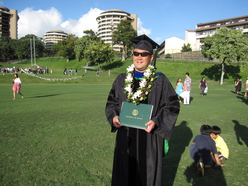 人類学部を卒業して、博士の称号を授与されたT.Y.さん レイをかけているのがハワイらしいところ |